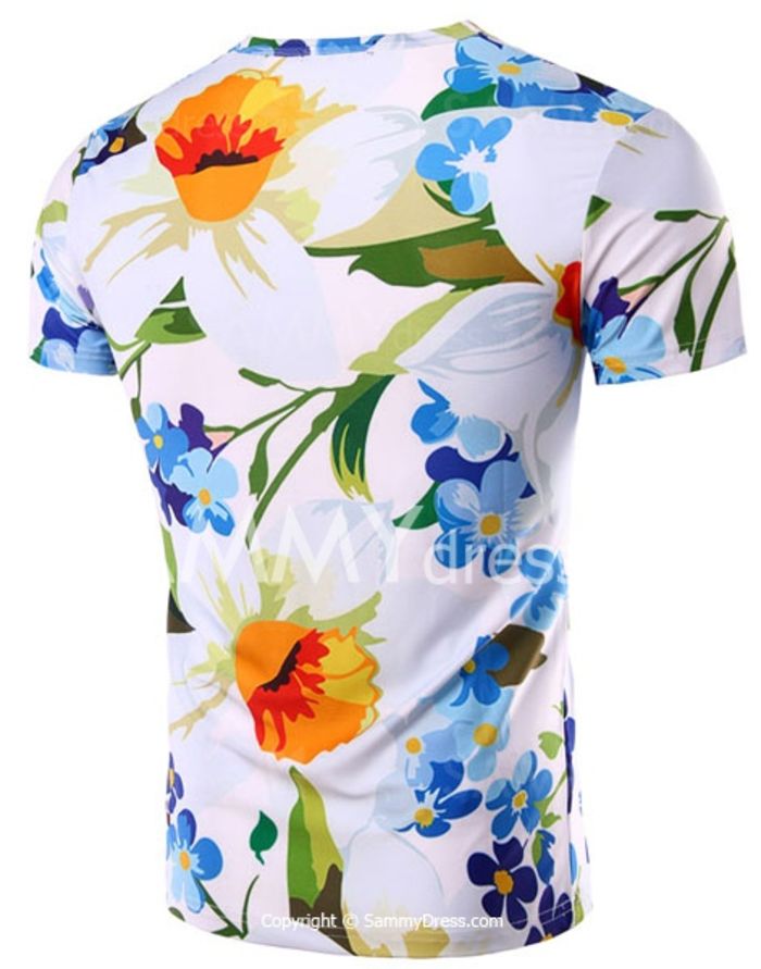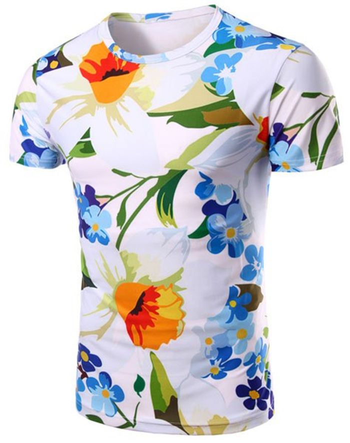 圆领花卉3D打印图案短袖男士T恤